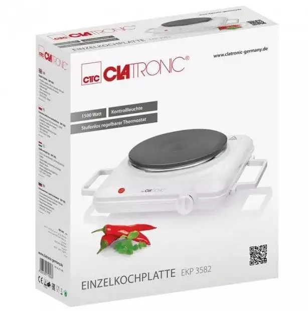 Для регулирования мощности нагрева в кухонной плите предусмотрен один регулятор, расположенный на передней панели. Рабочая поверхность имеет эмалированное покрытие, что обеспечит максимальную простоту и комфорт во время обслуживания. Корпус плиты выполнен в универсальном белом цвете, поэтому Clatronic EKP 3582 подойдет к большинству существующих интерьеров.
