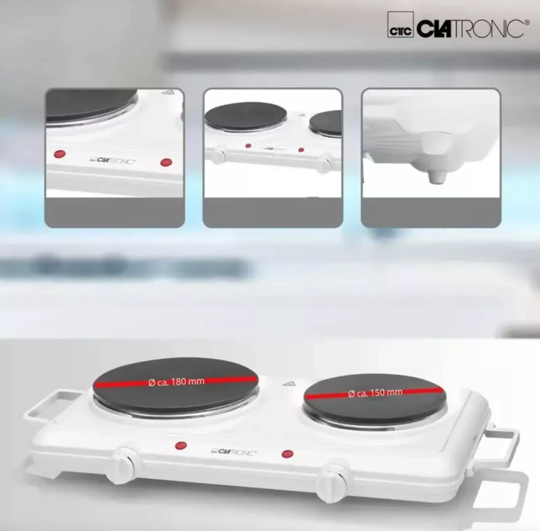 Компактна кухонна плита без духовки Clatronic DKP 3583 є відмінною альтернативою великий кухонній плиті в умовах обмеженого простору або на дачі. Працює плита від електрики, має досить компактні розміри і невелика вага, що дозволить переносити її та встановлювати в зручному місці, а наявність двох бокових ручок створить додаткову зручність при транспортуванні. Для більш легкого регулювання потужності нагріву електричних конфорок передбачено 2 плавно регульованих термостата і два світлових індикатори. Безпечну та надійну експлуатацію кухонної плити Clatronic DKP 3583 забезпечує міцна конструкція в поєднанні з термоізольовані покриттям.