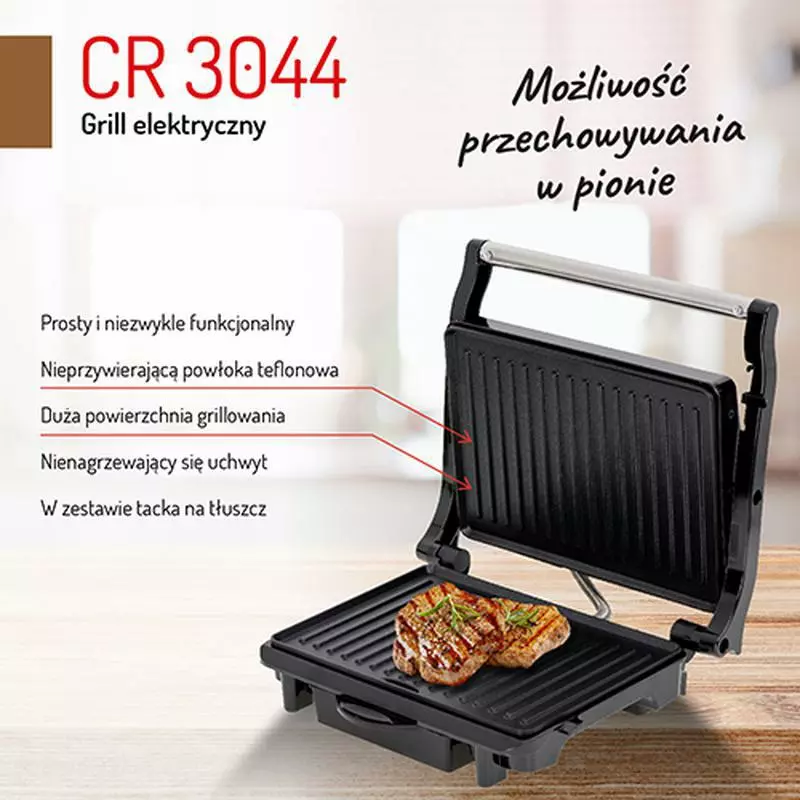Електричний гриль CAMRY CR 3044 з максимальною потужністю 2100 Вт дозволяє готувати широкий асортимент гарячих страв - від підсмажених гамбургерів, через стейки, свинячу шию, курку та інше м'ясо, до овочів та сиру на грилі. Нагрівальні плити закріплені тефлоновим покриттям, завдяки якому їжа не прилипає, а подальше миття займає буквально хвилину. Крім того, покриття дозволяє готувати на грилі без додавання жиру, а дренажний отвір жиру робить страви більш здоровими.