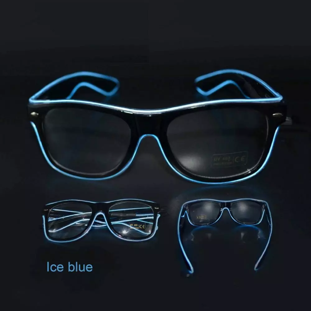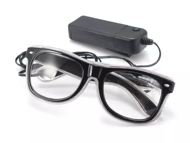Данные очки оснащены светодиодной неоновой полоской и маленьким удобным блоком питания для двух обычных батареек AA ( пальчиковые 1,5V ) с переключателем режимов свечения. Свечение происходит в трех режимах: обычный статический, вспышка, flash.