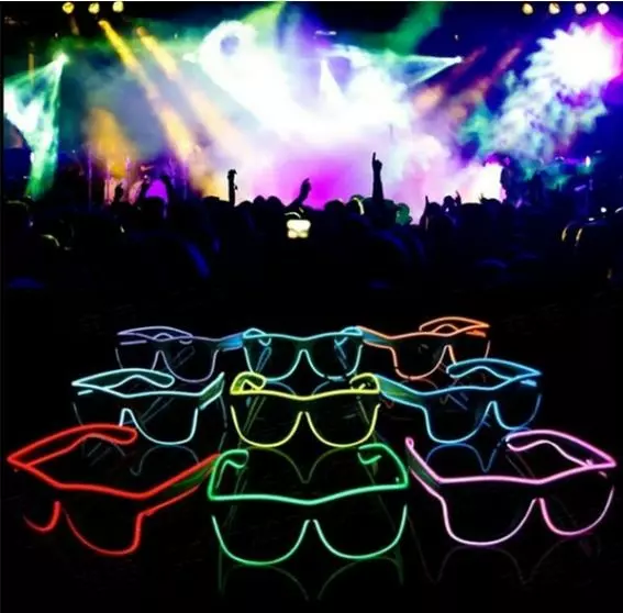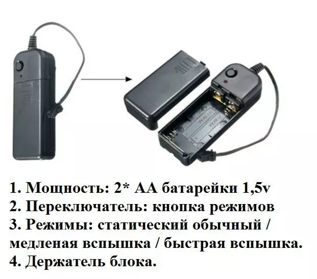 Данные очки оснащены светодиодной неоновой полоской и маленьким удобным блоком питания для двух обычных батареек AA ( пальчиковые 1,5V ) с переключателем режимов свечения. Свечение происходит в трех режимах: обычный статический, вспышка, flash.