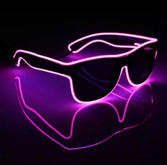 Данные очки оснащены светодиодной неоновой полоской и маленьким удобным блоком питания для двух обычных батареек AA ( пальчиковые 1,5V ) с переключателем режимов свечения. Свечение происходит в трех режимах: обычный статический, вспышка, flash.