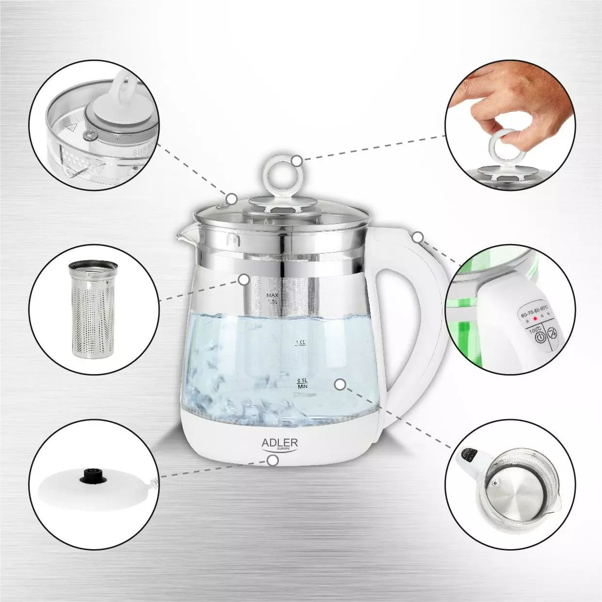 Скляний чайник Adler AD 1299 1,5 л із заварювальним блоком і регулятором температури