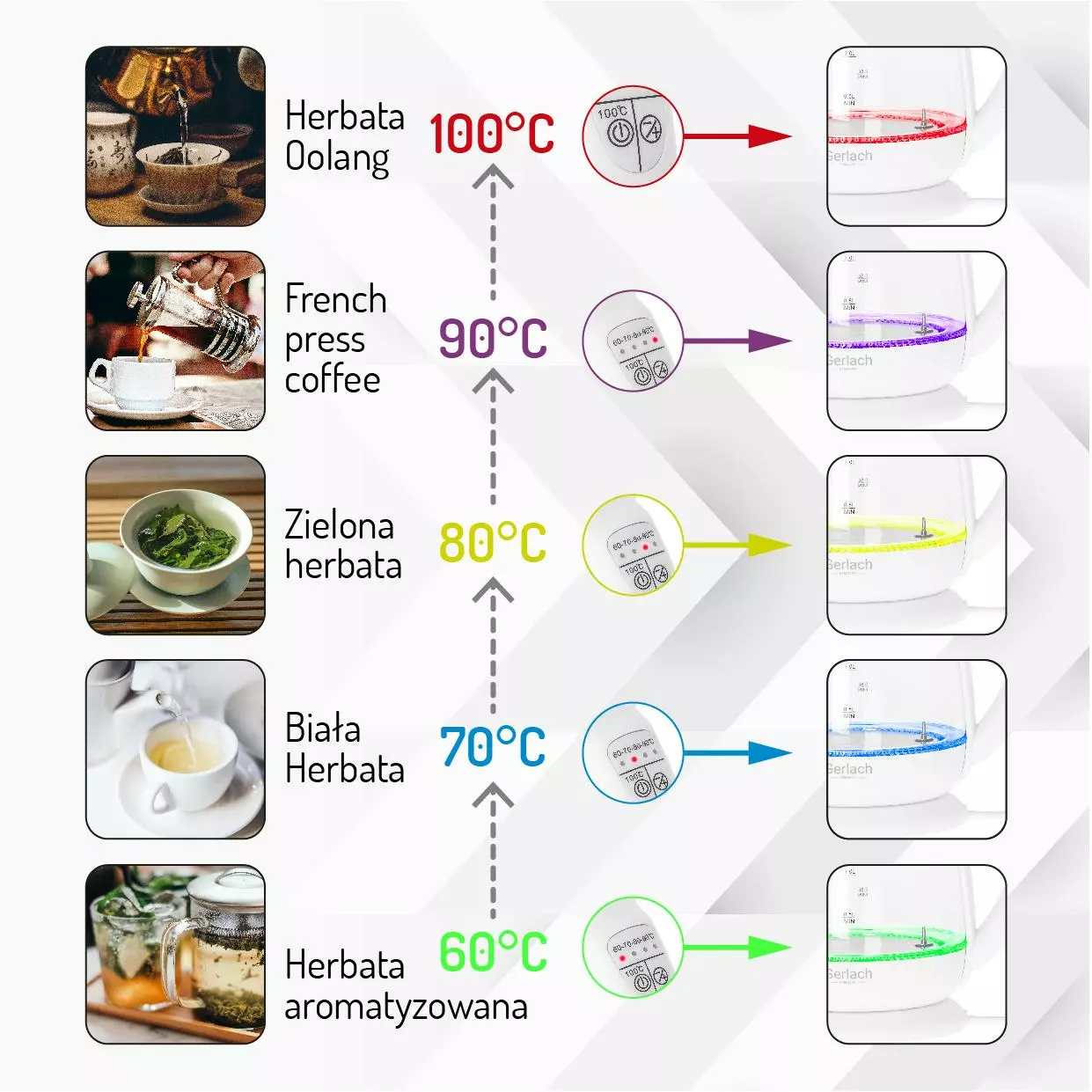 - Різні кольори підсвічування окропу в залежності від обраної температури