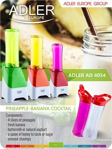 Небольшой, очень практичный персональный блендер. Оснащенный 2 чашками емкостью 600 миллилитров, он позволяет мгновенно приготовить вкусный напиток и сразу же взять его с собой. Крышка чашки оснащена мундштуком, и весь контейнер можно безопасно транспортировать или закреплять, например, на велосипеде. Блендер доступен в весенних цветах: желто-зеленый, оранжево-желтый и красно-розовый. Идеально подойдет как для активного человека, так и для любого, кому нужна чашка с энергетическим коктейлем.